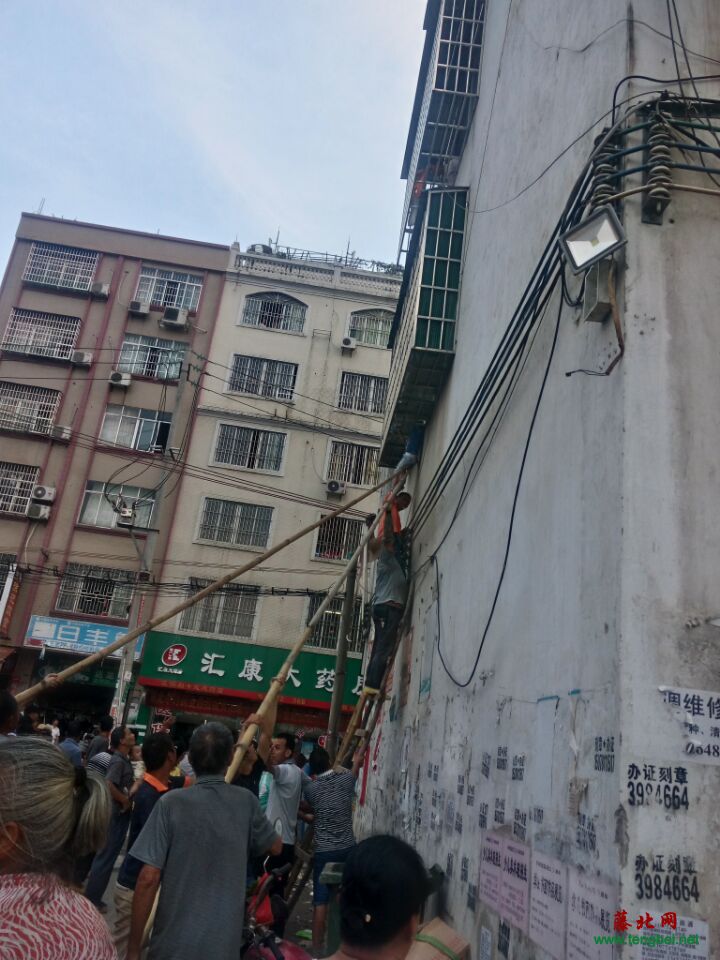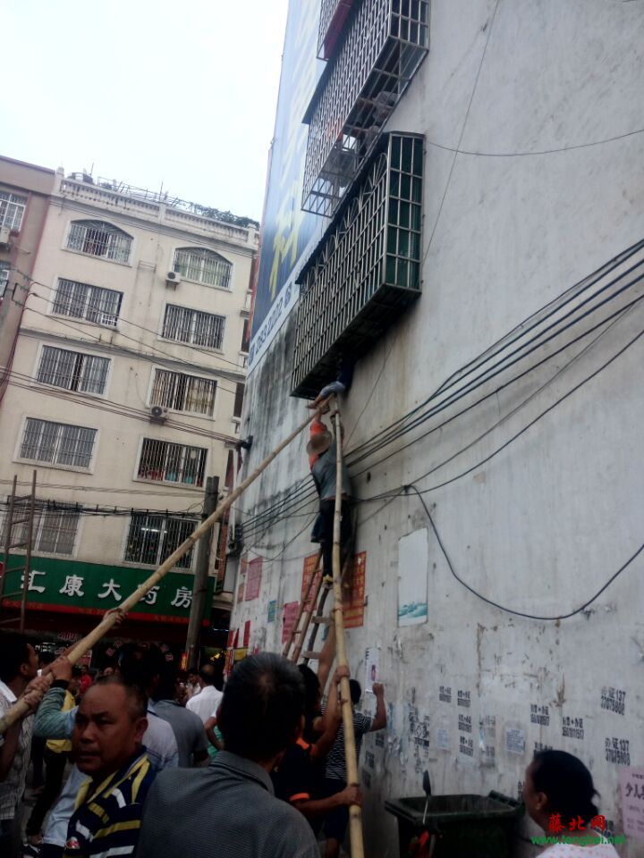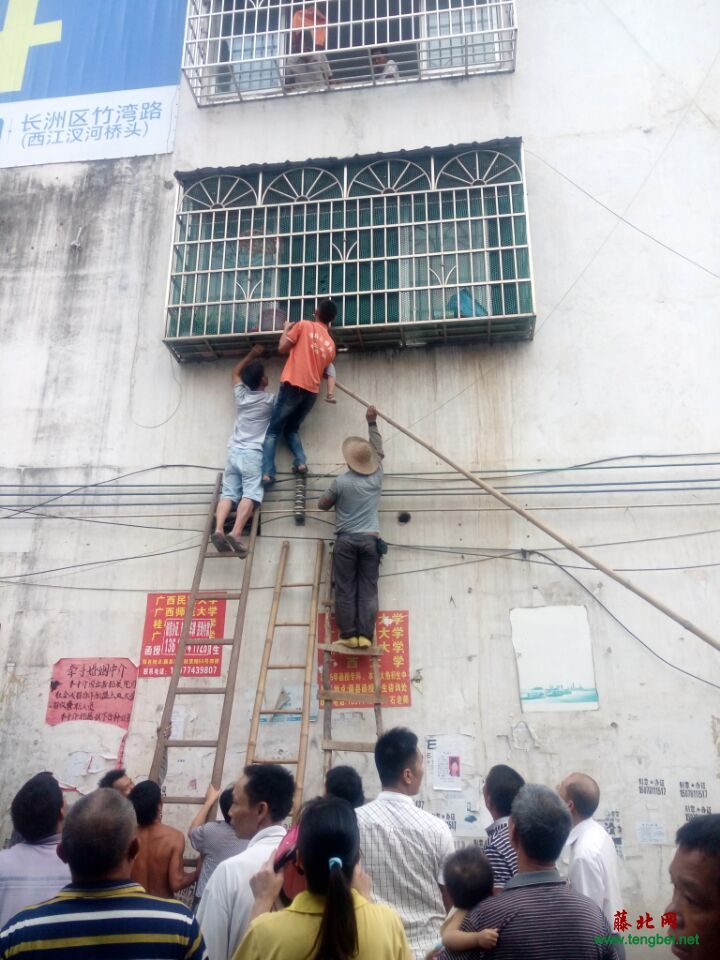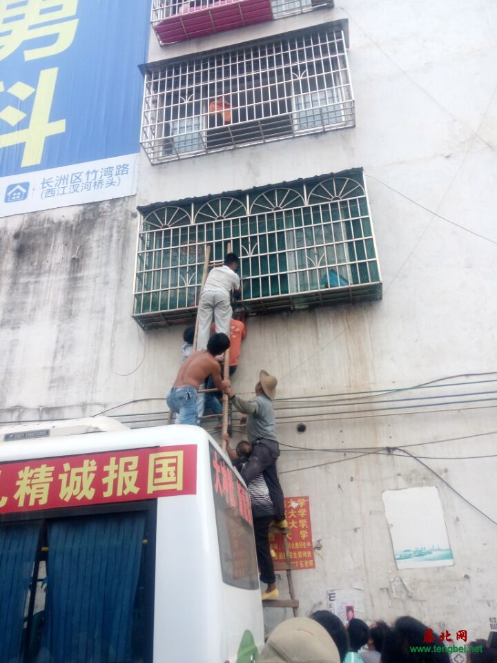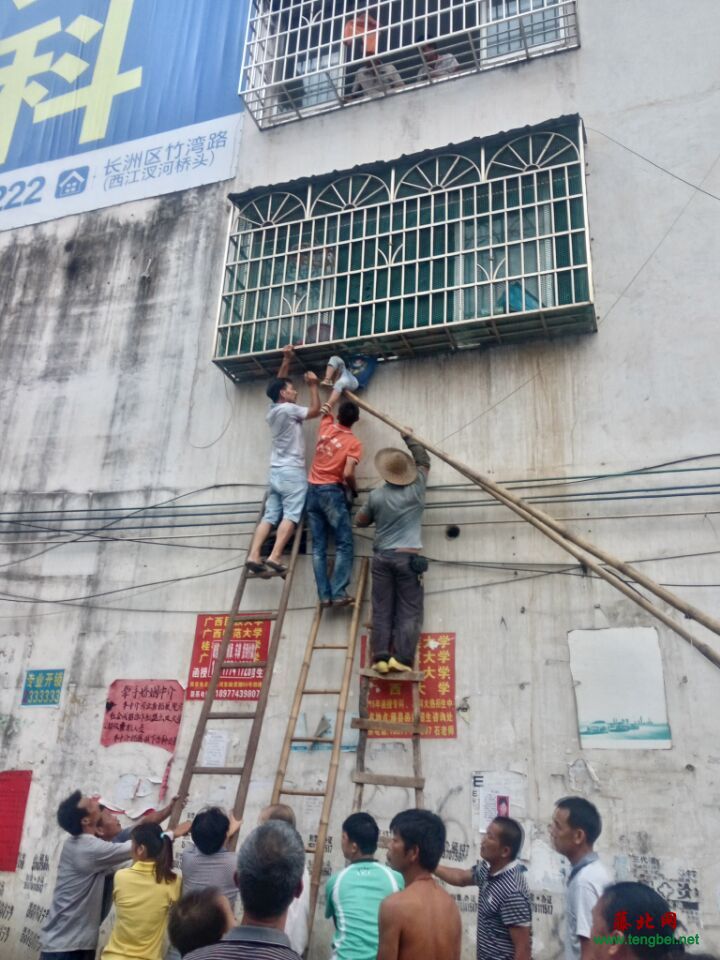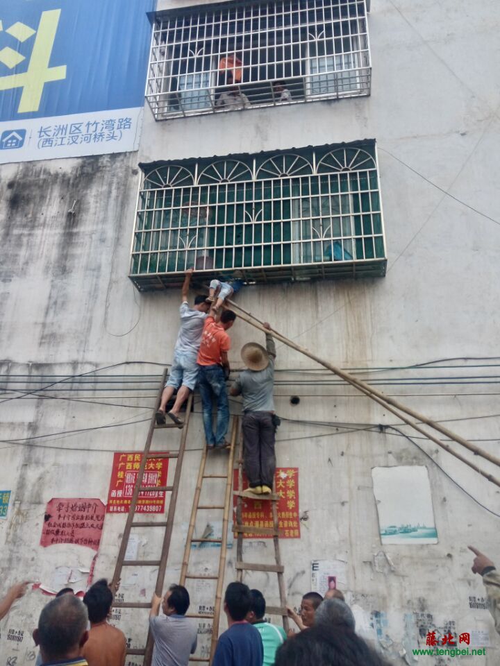 下午在县城旧农机厂,一小孩子在屋窗台玩,结果掉下去,头刚好卡在防盗网,好在自己双手抓住防盗网,附近有楼梯和一帮热心人和一部公交车来支援,孩子被救下来,没有什么大问题,可能颈部有红肿。网友说这种精神值得表扬