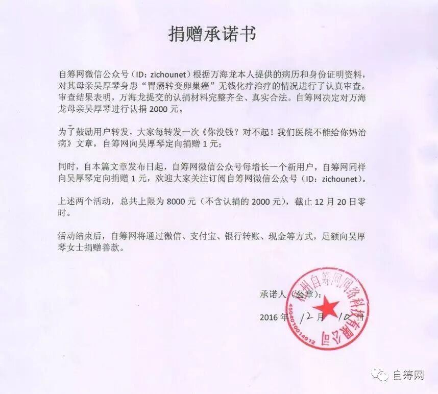 自筹网微信公众号(ID:zichounet)根据万海龙本人提供的病历和身份证明资料,对其母亲吴厚琴身患“胃癌转变卵巢癌”无钱化疗治疗的情况进行了认真审查。审查结果表明,万海龙提交的认捐材料完整齐全、真实合法。自筹网决定对万海龙母亲吴厚琴进行认捐2000元。